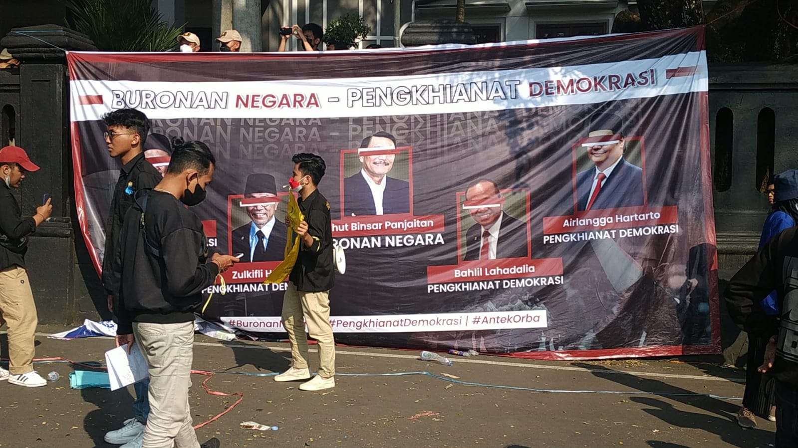 Selain memasang poster tersebut, mahasiswa juga menggelar orasi di atas mobil komando dengan menyebut deretan tuntutan mereka. Dalam orasinya, mereka mengritik keras kenaikan harga BBM jenis Pertamax serta kelangkaan minyak goreng.