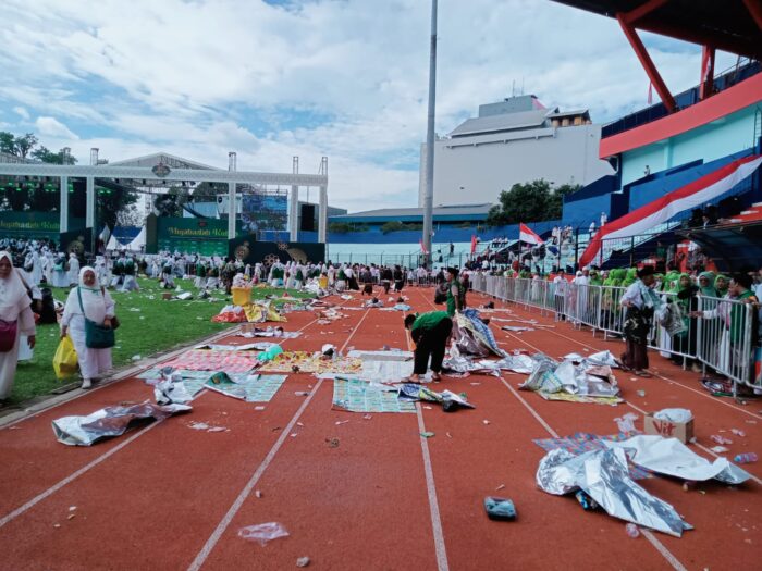 Ribuan jemaah yang memadati kawasan stadion sejak pagi meninggalkan volume sampah cukup besar, terutama dari sampah plastik, kemasan makanan, serta alas duduk yang digunakan para peserta.