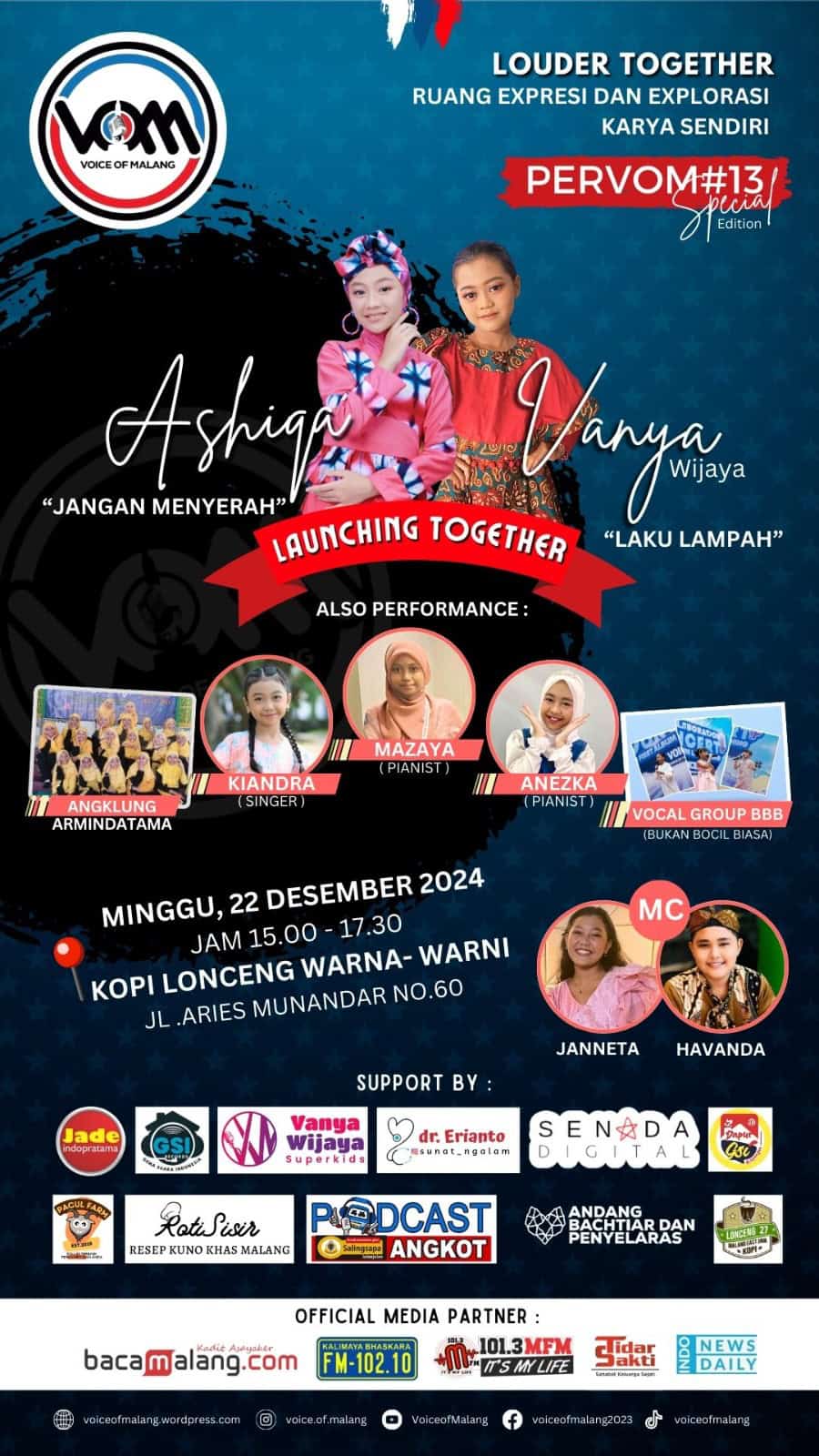 Selain persembahan special dari Vanya Wijaya dan Ashiqa, pervom#13 kali ini juga akan dimeriahkan dengan penyanyi cilik Kiandra, dua Pianist cilik – Anezka dan Mazaya, trio penyanyi cilik BBB ( Bukan Bocil Biasa ), persembahan Angklung Mindatama serta dipandu duo MC Janneta dan Havanda.