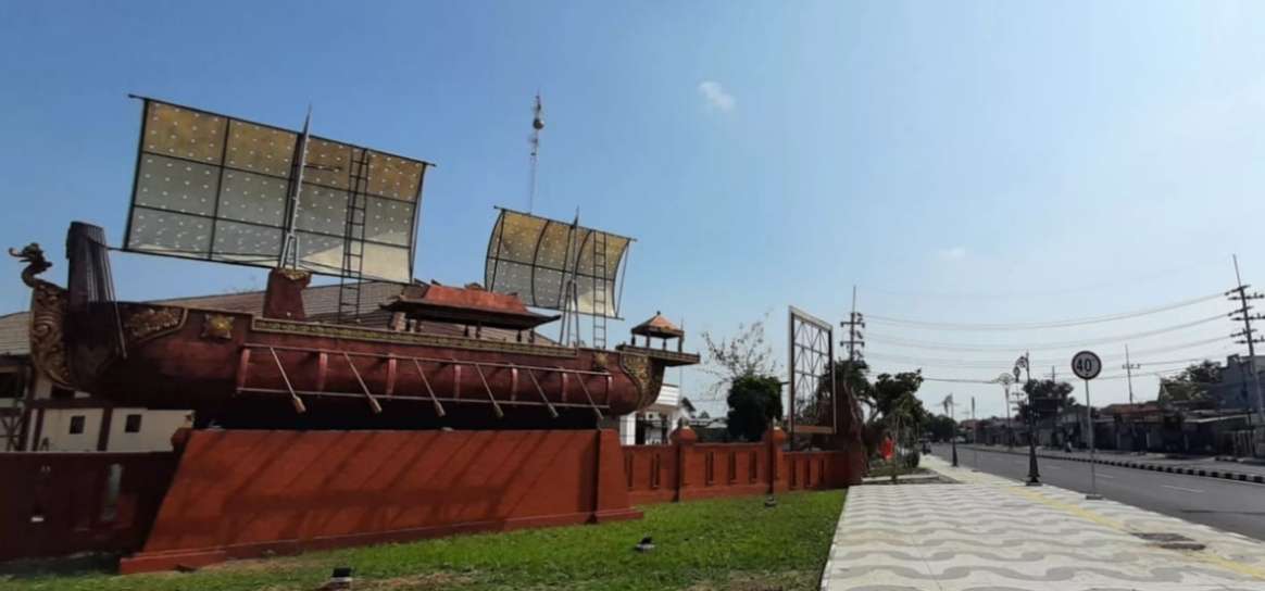 Foto: Repelika perahu Majapahit yang berada di depan kantor Kecamatan Magersari.