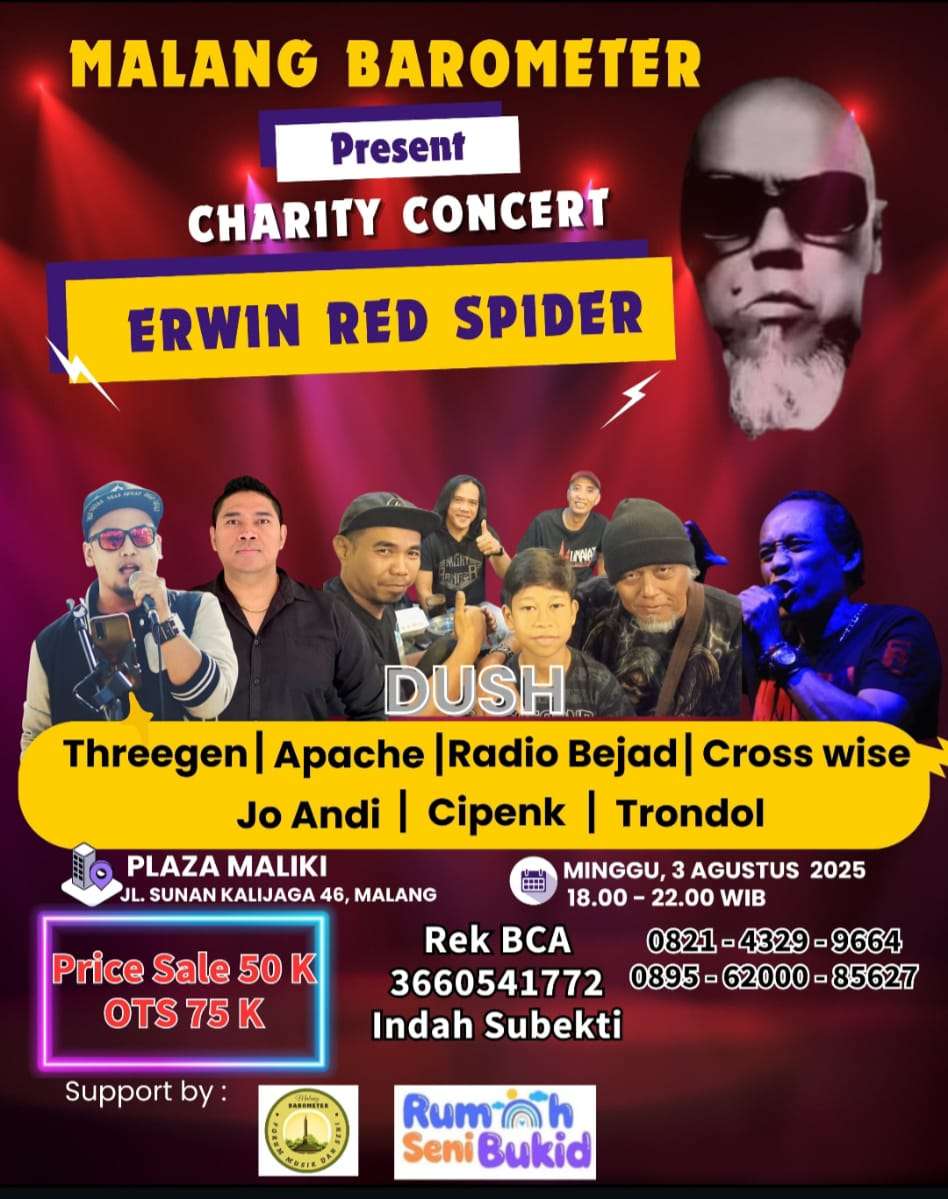 indonewsdaily.com, Malang – Malang Barometer akan menggelar konser musik charity untuk mendukung Erwin Red Spider, vokalis band rock Legendaris Indonesia yang saat ini sedang menjalani perawatan pasca operasi stroke.
