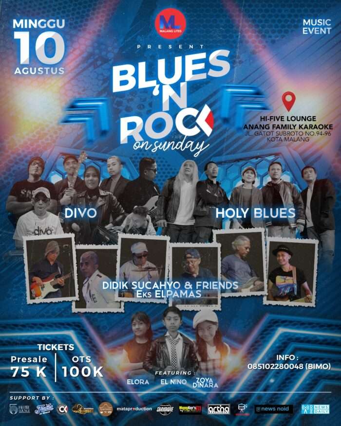 indonewsdaily.com, Malang – Malang Lites Present kembali menggebrak dengan event musik terbaru bertajuk “Blues n’ Rock” yang akan digelar pada Minggu, 10 Agustus 2025, di Hi-Five Lounge Anang Family Karaoke, Jalan Gatot Subroto No. 94-96, Kota Malang.