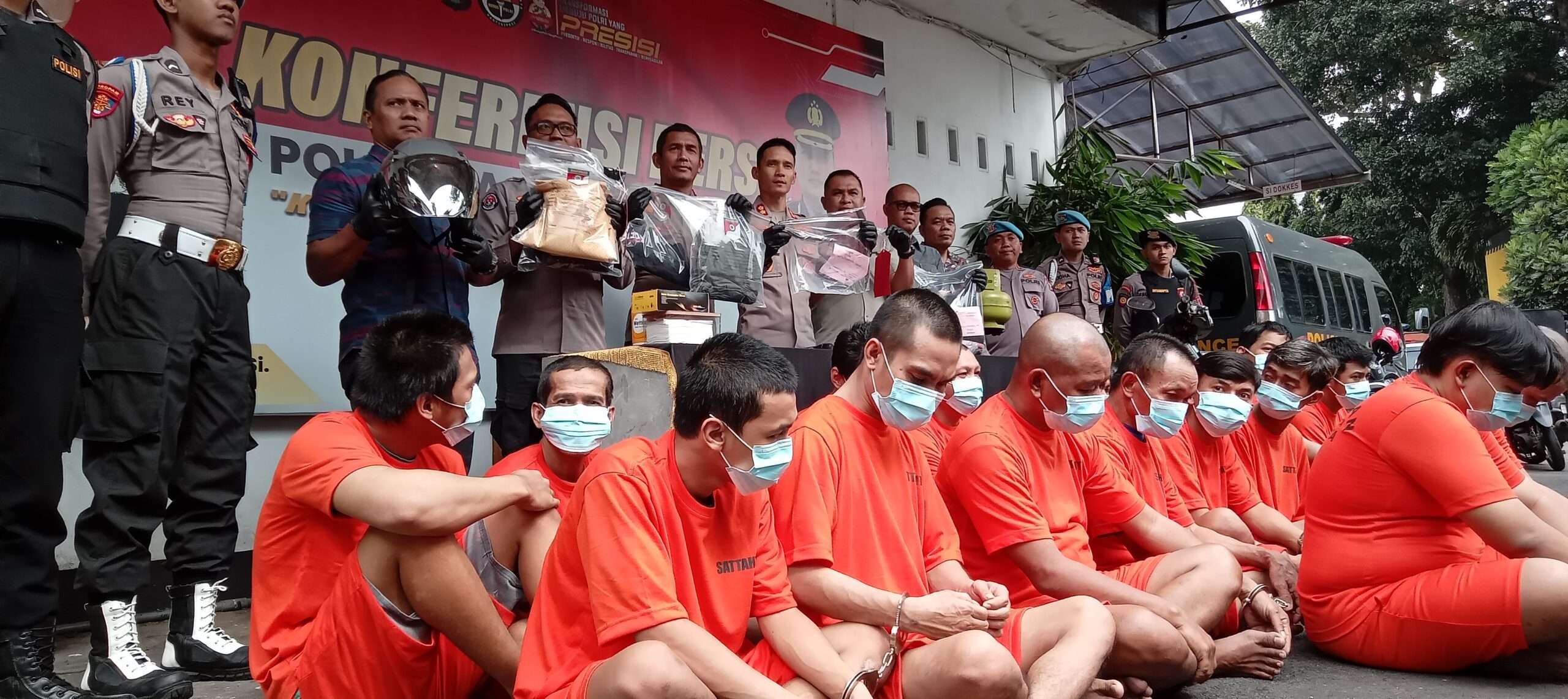 “Masing-masing satu buah jaket hoodie kemudian celana jeans, topi, sepeda motor satu unit, kemudian ada tabung gas elpiji 3 kg satu, senjata tajam jenis sabit celurit, kemudian helm, juga kursi kayu, baju, pisau kemudian kaos berwarna hitam, jaket warna merah, celana panjang abu-abu. itu semua barang bukti yang kita amankan. Sedangkan yang didepan ini adalah tersangka yang sudah kita amankan, dan tentunya nanti kita tetap proses lanjut sampai dengan ke pengadilan,” ucapnya.