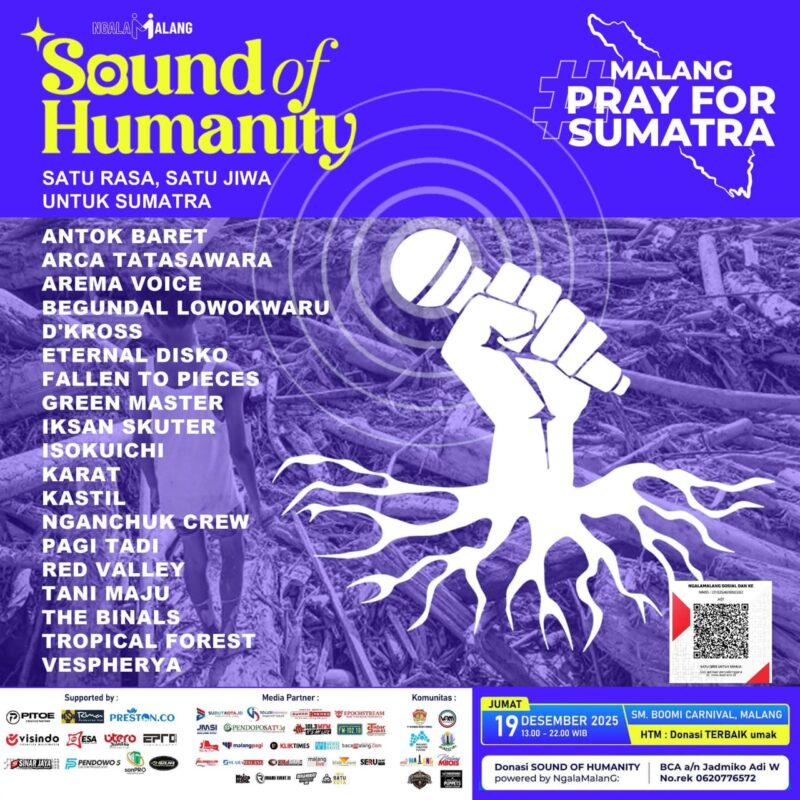 “NGALAMALANG: Sound of Humanity” merupakan gerakan kolaboratif lintas komunitas yang bertujuan mendukung pemulihan pascabencana di Sumatra. Acara ini akan digelar pada Jumat (19/12/2025) di SM Boomi Carnival Malang, menampilkan sejumlah musisi dari Malang Raya.