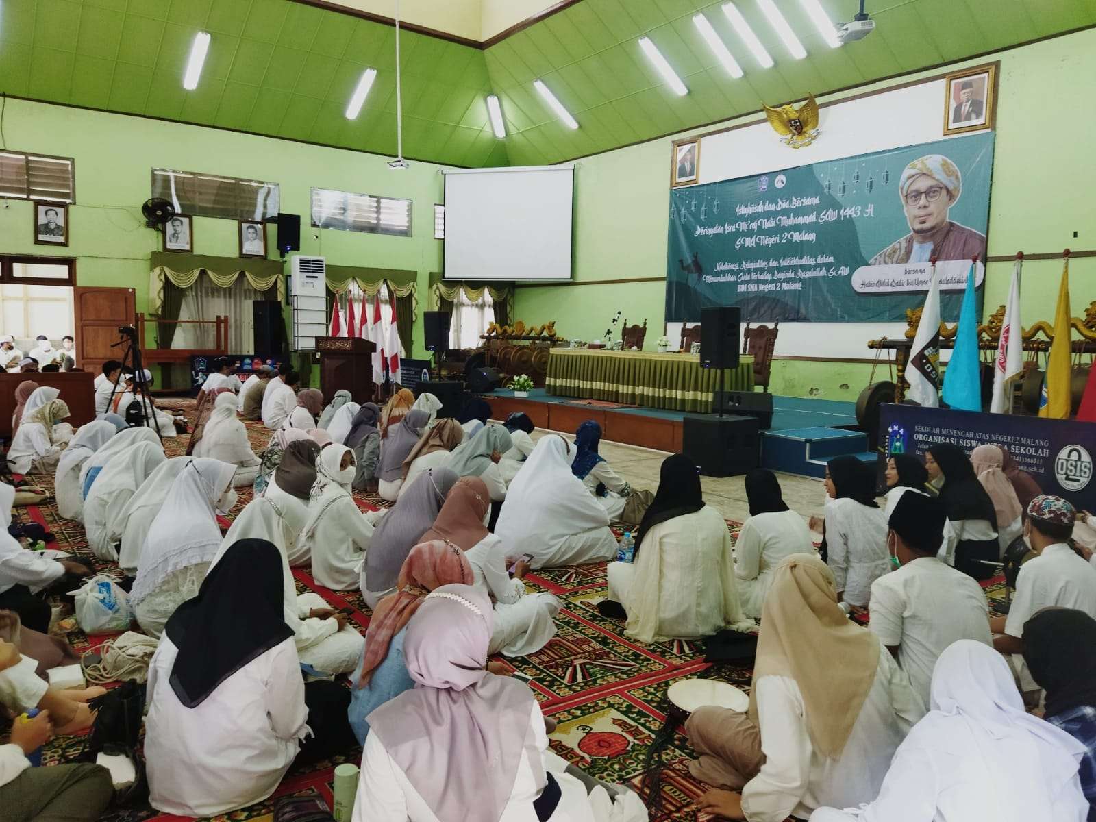 Indonewsdaily.com, Kota Malang – Isra Miraj adalah dua bagian perjalanan yang dilakukan oleh Nabi Muhammad dalam waktu satu malam saja. Peristiwa ini merupakan salah satu peristiwa penting bagi umat Islam, karena pada peristiwa inilah Nabi Muhammad SAW mendapat perintah untuk menunaikan salat lima waktu sehari semalam. Isra Miraj diperingati setiap tanggal 27 Rajab tahun Hijriah. Bertempat di SMA NEGERI 2 Malang yang beralamatkan di Jl. Laksamana Martadinata 84 Kota Malang,
