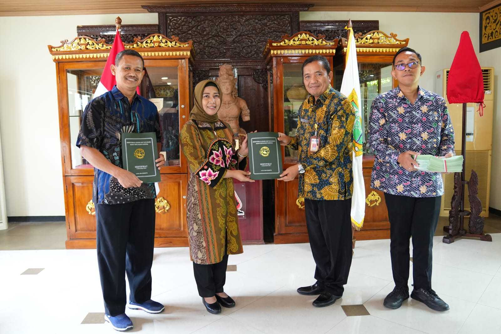 Sertifikat diterima secara simbolis oleh Wali Kota Mojokerto, Ika Puspitasari dari Kepala Kantor Pertanahan Kota Mojokerto, Carso Ahdiat, di Sabha Pambojana, Rumah Rakyat Kota Mojokerto, Jumat (8/12/2023).