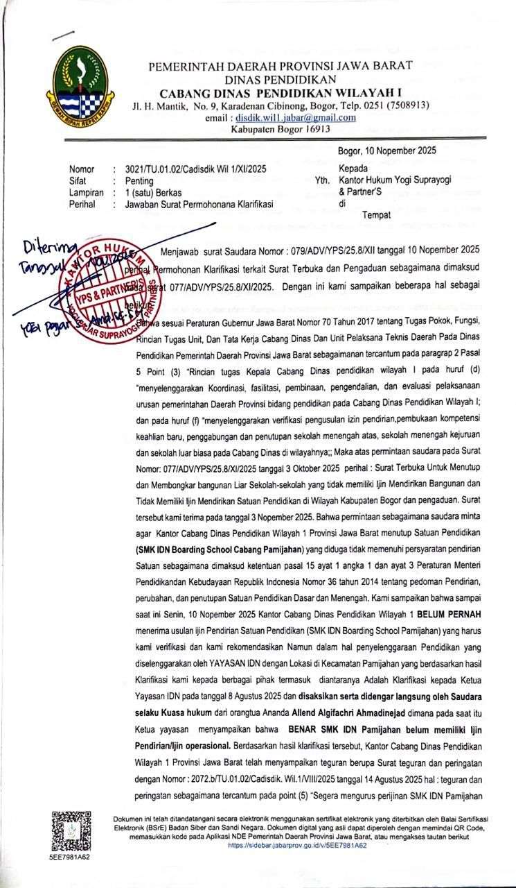 Dalam Isi Surat Jawaban Klarifikasi yang diterbitkan oleh Pemerintah Daerah Provinsi Jawa Barat Dinas Pendidikan, Cabang Dinas Pendidikan Wilayah I Kabupaten Bogor tertuang, bahwa Kantor Cabang Dinas Pendidikan Wilayah I Kabupaten Bogor belum pernah menerima usulan Pendirian Satuan Pendidikan SMK IDN Boarding School Pamijahan Bogor.