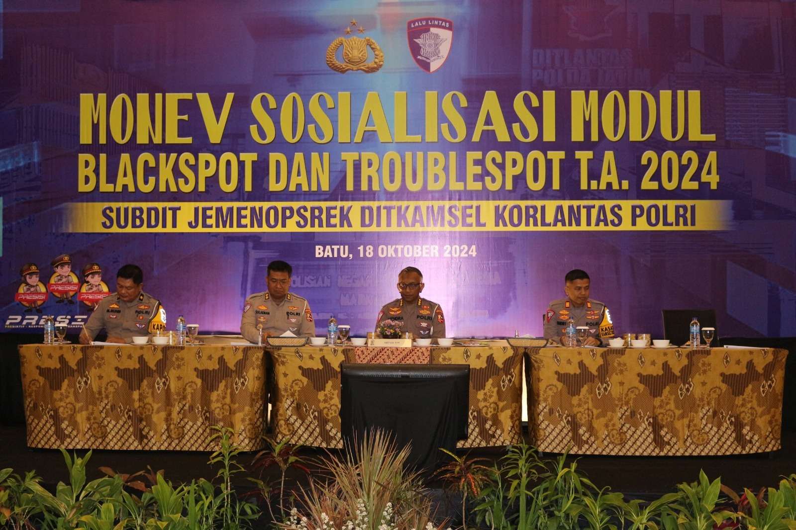 indonewsdaily.com, Batu – Polres Batu melalui Satuan Lalu Lintas (Satlantas) menggelar acara Monitoring dan Evaluasi (Monev) Sosialisasi Modul Blackspot dan Trouble Spot T.A. 2024. Kegiatan yang bertempat di Singhasari Hotel & Resort, Kota Batu, ini dipimpin oleh Kasat Lantas Polres Batu, AKP Diamond Romansa Bangun, S.T.K., S.I.K., M.H., yang mana beliau mendampingi Tim Korlantas Polri yang diwakili oleh Kombes Pol. Vendra Riviyanto, S.I.K., M.H., dari Subdit Jemenopsrek Ditkamsel Korlantas Polri, Jum’at (18/10/2024).