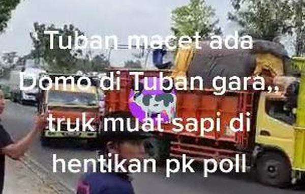Video yang viral itu juga diberi caption ‘Tuban Macet ada domo di Tuban gara,, truk muat sapi dihentikan pk Poll’.